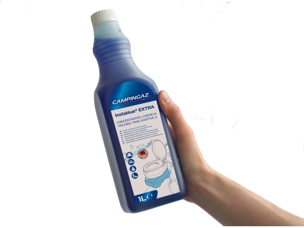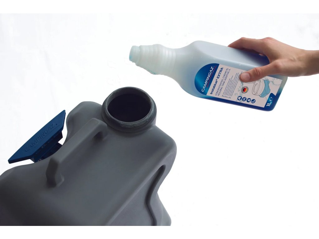 Díky praktickému dávkování – 1 plné víčko (10 ml) na každé 2 litry odpadu – je jeho použití velmi jednoduché a ekonomické. Koncentrát se ředí vodou přímo v odpadní nádrži. Campingaz Instablue Extra je vybaven bezpečnostní dětskou pojistkou, která zabraňuje nechtěnému otevření lahve. Pro příležitostné použití chemického WC se doporučuje vyprázdnit nádrž nejpozději po týdnu, i když není zcela plná.